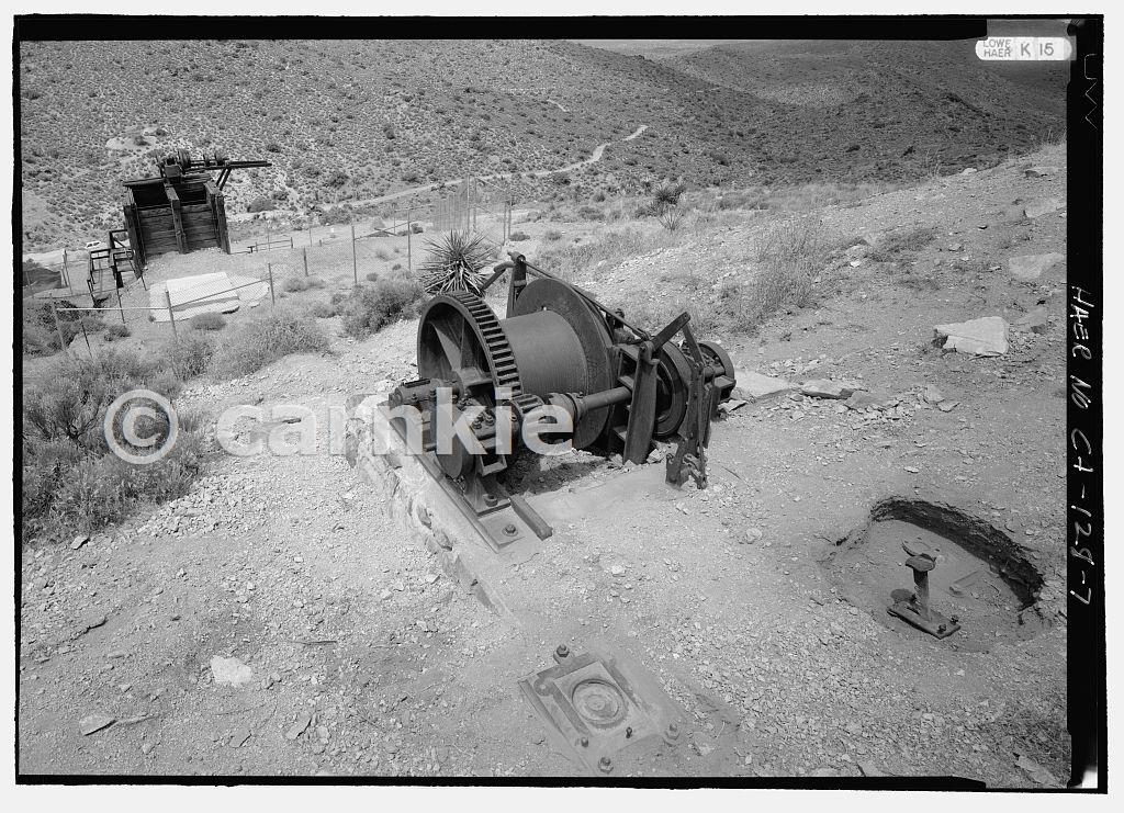 STEAM POWERED HOISTING WINCH, NOTE UNEARTHED CLUTCH TO RIGHT OF PICTURE Library of Congress, Prints & Photographs Division, HAER reproduction number HAER CAL,36-TNPAL.V,5-7