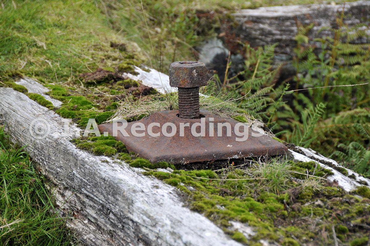Bolt and plate at the (down hill) end of the large waterwheel pit, for 60ft waterwheel which pumped Engine shaft. [August 2018]