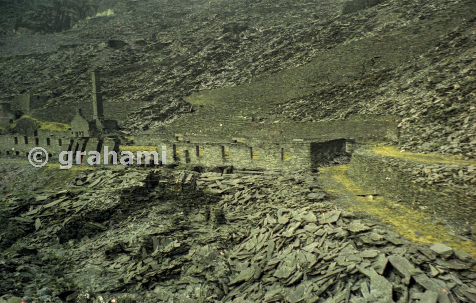 A very noticeable chimney stack and engine house, along with the buttresses supporting the centre section wall. The upper level tramway was constructed in the 1880s to connect the mill with the Middle Quarry mills (Gloddfa Ganol)