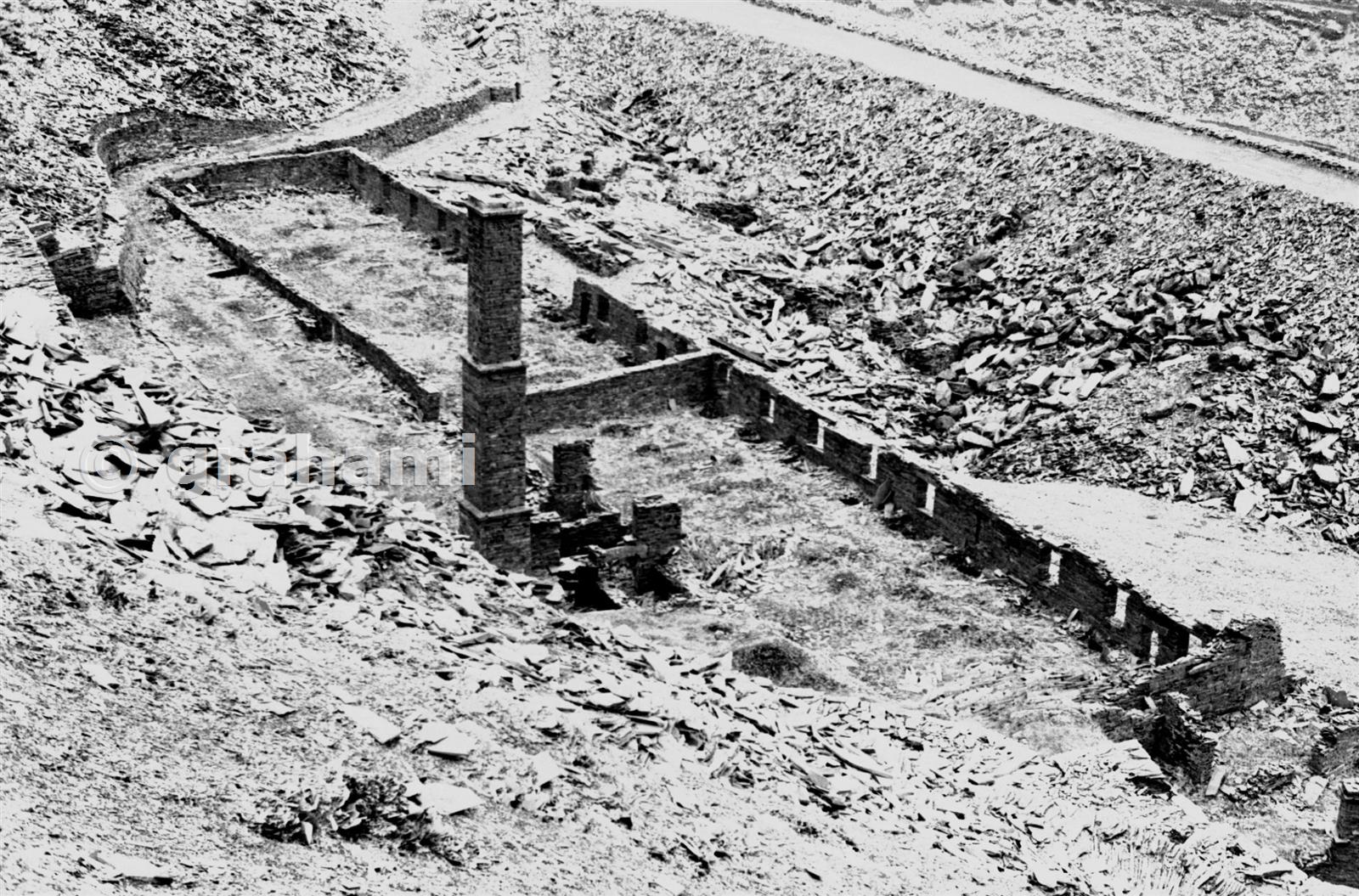 Viewed from above and to the south. The original mill with its centrally positioned engine house is on the right and the slightly later extension to the left.