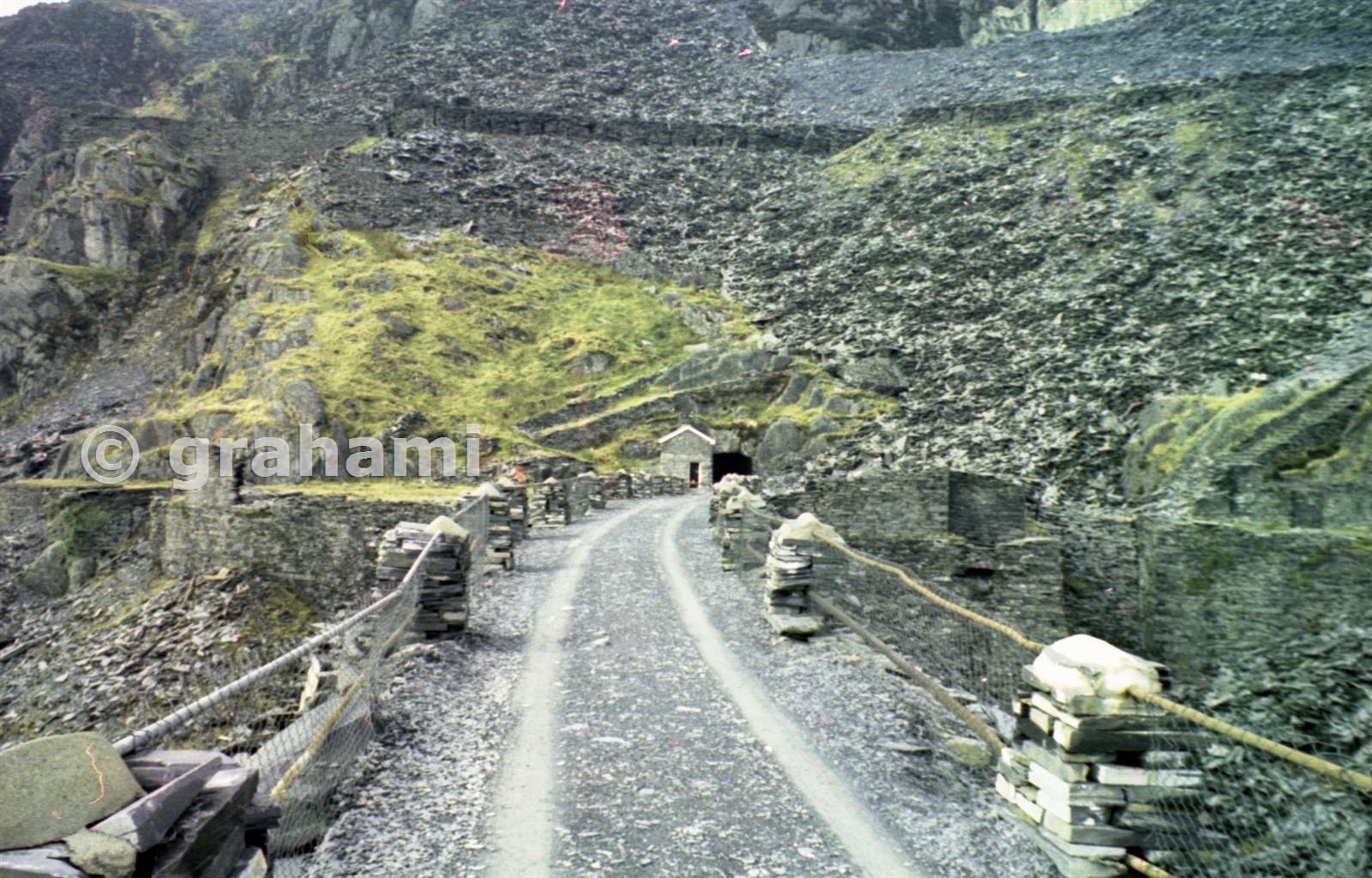 Looking from the Middle Quarry "Big Tip" towards the entrance to Hollands'' Main or "Limit Level" tunnel in the distance. The tunnel dates from around 1839 or so. From left to right you can see the tipping gallery, then the top of the original footpath from Dinas Rhiwbryfdir many hunderesds of feet below, then the remaining corner of Hollands'' slab mill. Above the level entrance and its old weighhouse is one of the old pathways up to the quarry, while further right is the other corner of the slabmill, the discharge/overflow from its wheelpit and the filled in slot of the head of Hollds'' 1839 incline to Dinas. On the extreme right are another flight of quarry steps and an old building.