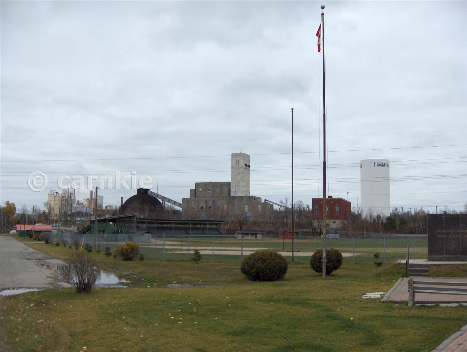 Hollinger Mine. The headframe is the light-colored building in the center, unusual in that it is built of concrete. The dome-shaped building to the left is an ore storage facility.