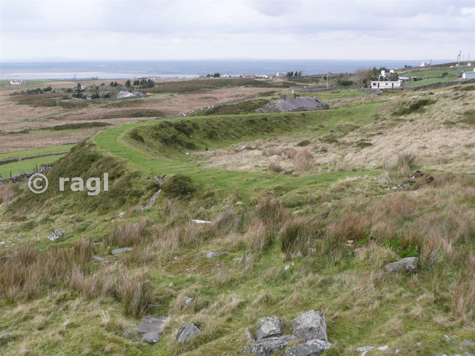 Looking down on the course of the tramway. The curved embankment in the foreground leads the track away downgrade through a further series of curves to Drumhead, just off picture to the left. The trackbed can be seen above the roof of the derelict building in the foreground. Wicklow Hills on the horizon, top left.