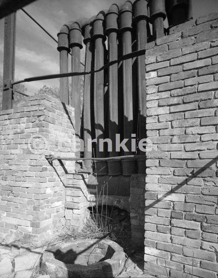 DETAIL, 3/4 VIEW OF HOT BLAST STOVE ON TOP OF FURNACE SHOWING CAST-IRON RETORTS AND TURNED HEAD (WHERE RAW MATERIALS WERE LOADED INTO FURNACE. Courtesy Library of Congress, Prints & Photographs Division, HAER, Reproduction number HAER MD,24-SNOHI.V,2-3