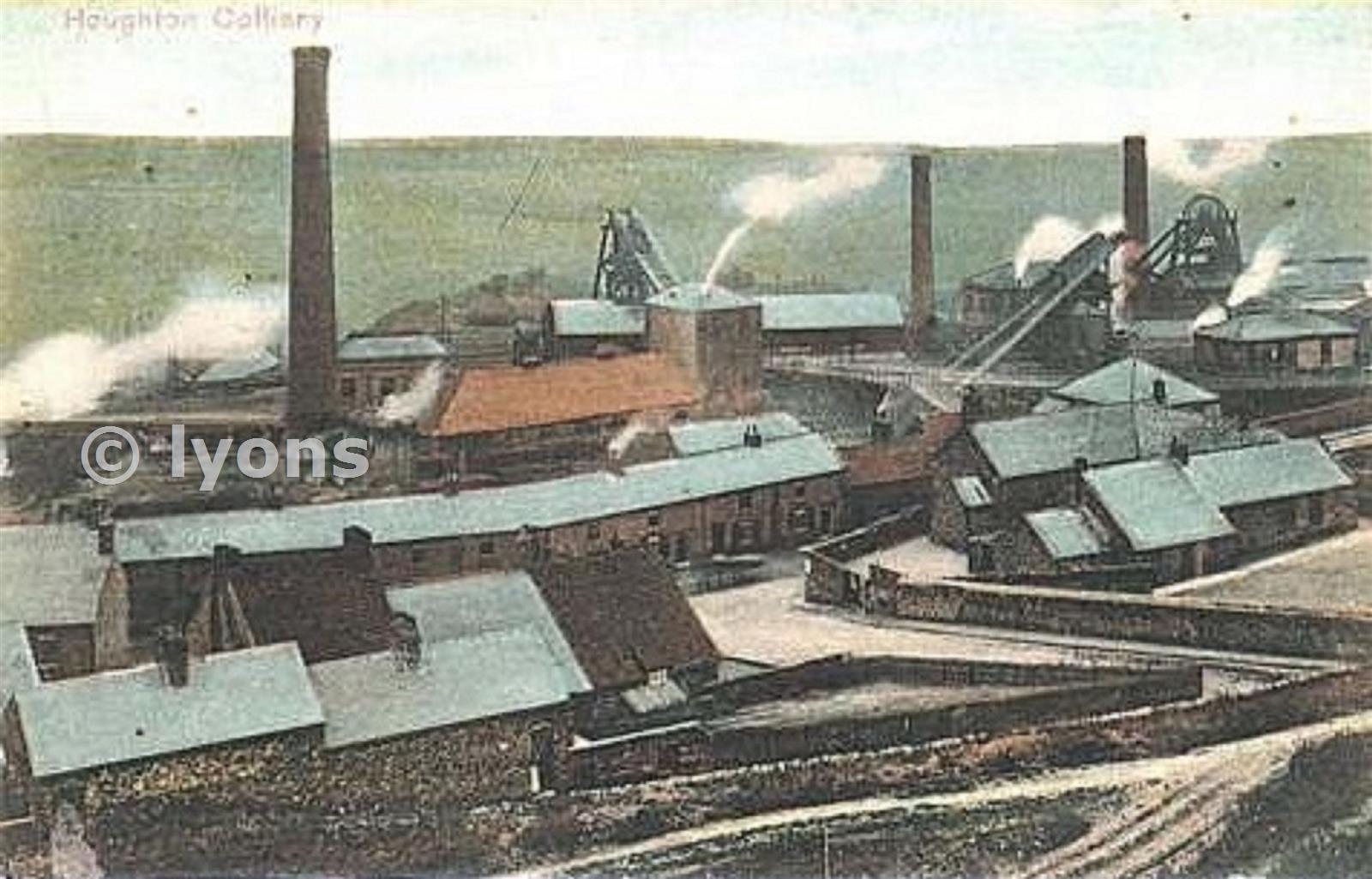 Looking west, with the upcast (North pit) shaft on the right and the downcast shaft on the left (south pit), which in this picture shows a Vertical type Winder similar to the one at Beamish Museum, in the future it will receive a new headstock facing the opposite direction and a new winder House. Whilst the upcast shaft looks similar to pictures just before it closed but will more likely be modified or even a new Headstock? The winding wheel for instance looks huge in this picture but will be tiny in later ones. The majority of the main buildings in the lower half of this scene lasted until the 1980s but were mostly cleared away when the mine closed. note the row of housing that backed onto the pit yard, like most Collieries of this age the shafts were situated close to a main road (Houghton to Newbottle A182) but its buildings will eventually spill out over the main road. The buildings lower left is now occupied by Houghton Comrades club and Houghton car sales, whilst to the right below the north shaft is now Tyrespot.