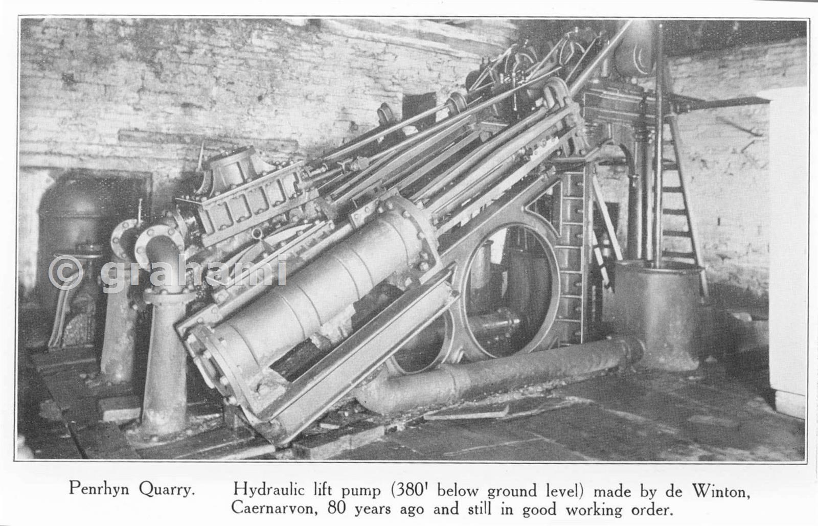 This shows one of the two hydraulic pumps installed underground at Penrhyn Quarry benaeth Red Lion floor at the level of the main drainage adit. The three-throw pumps lifted from Lady floor. Water was supplied to the pumps from a header tank on Sinc Bach Floor, thence down the Lord balance shaft. The photo is taken from "The Penrhyn Quarry - over 150 years of progress" which was published by the North Wales Chronical in the 1920's. My scan was taken from a surviving copy of the original. The two engines were built by Easton, Amos & Anderson and DeWinton's, although who built which bits and how is open to discussion.