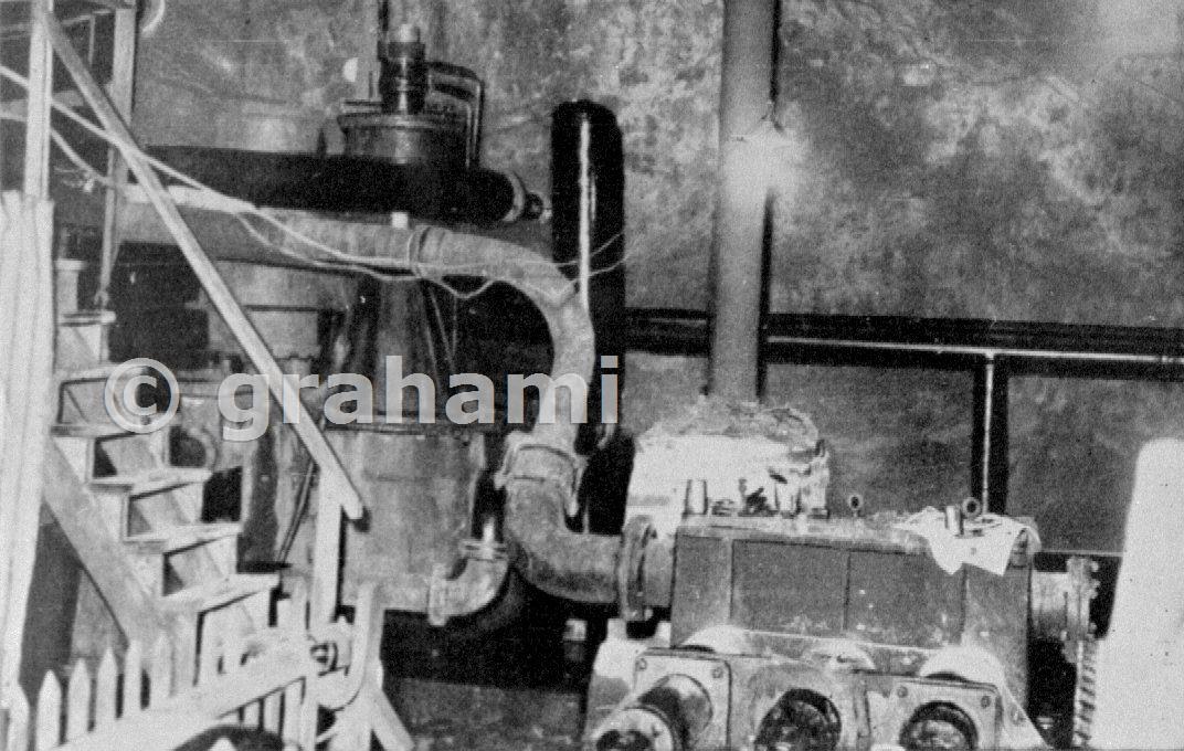 The water pressure from the old Hafodty quarry reservoir was used to help the electric pumping by driving a "Hydrostat" pump. This was situated on the D floor, now flooded, a chamber to the west of the Old Robey incline.