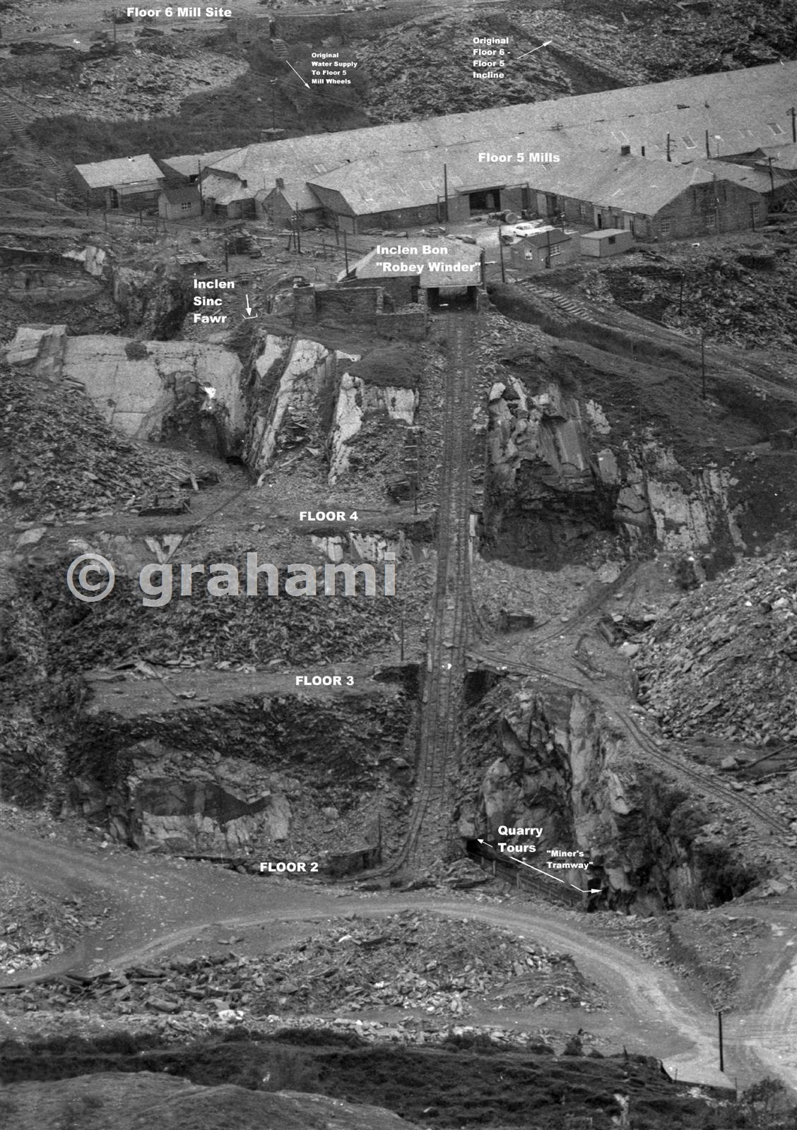 Taken from Cribau, this view shows the exposed extent of the "Inclen Bon" or Robey Incline from Floor 5 down to floor 2 - it certainly extended below this in the past at least as far as floor 1, if not lower. Paralle to it, and worked by the same drumhouse, via the sheave on floor 5 was the "Inclen Sinc Fawr"