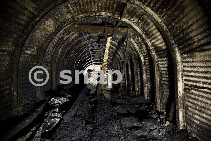 View looking up one of the adit inclines, with a tub stuck halfway down.