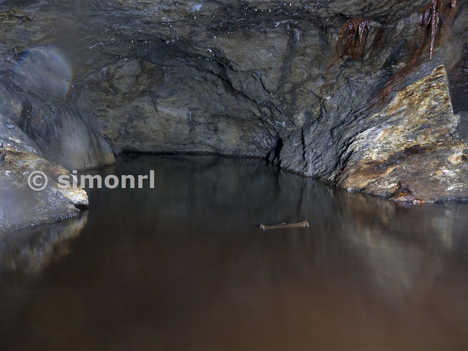 Crimp of incline leading to flooded lower workings - how deep? Rhiwbach slate mine May 2012