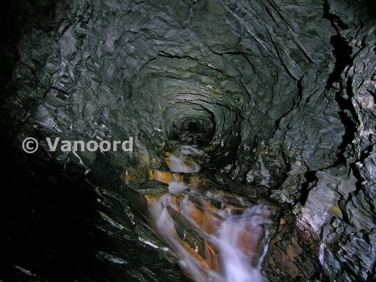The incline floor has been eroded back to the bare rock by the passage of water through the mine.