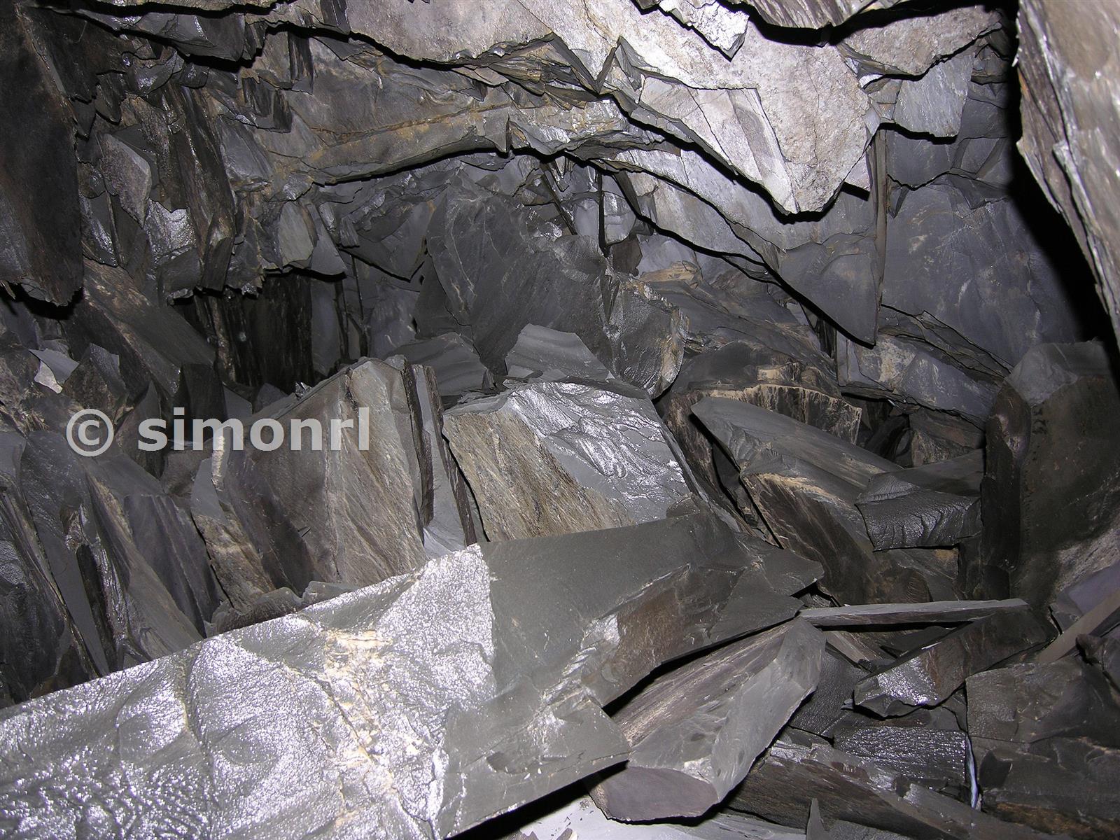 Inside the void left by the collapse of the floor 8 adit. having scrambled over the blocks in the photograph the dark area (left centre) showed a possibly squeezable gap to a widening of the level.