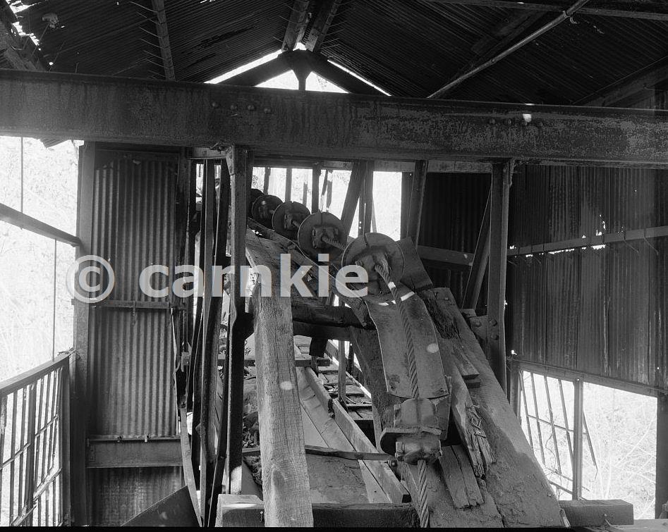 INTERIOR, DETAIL OF RETARDING CONVEYOR, SHOWING CAST IRON BUTTONS AND STEEL ROPE IN UPPER TROUGH IN CONVEYOR HOUSE, LOOKING NORTH; NOTE STEEL PLATES LINING WOODEN TROUGH. Courtesy Library of Congress, Prints & Photographs Division, HAER, Reproduction number HAER WVA,10-LOUT.V,1F-9