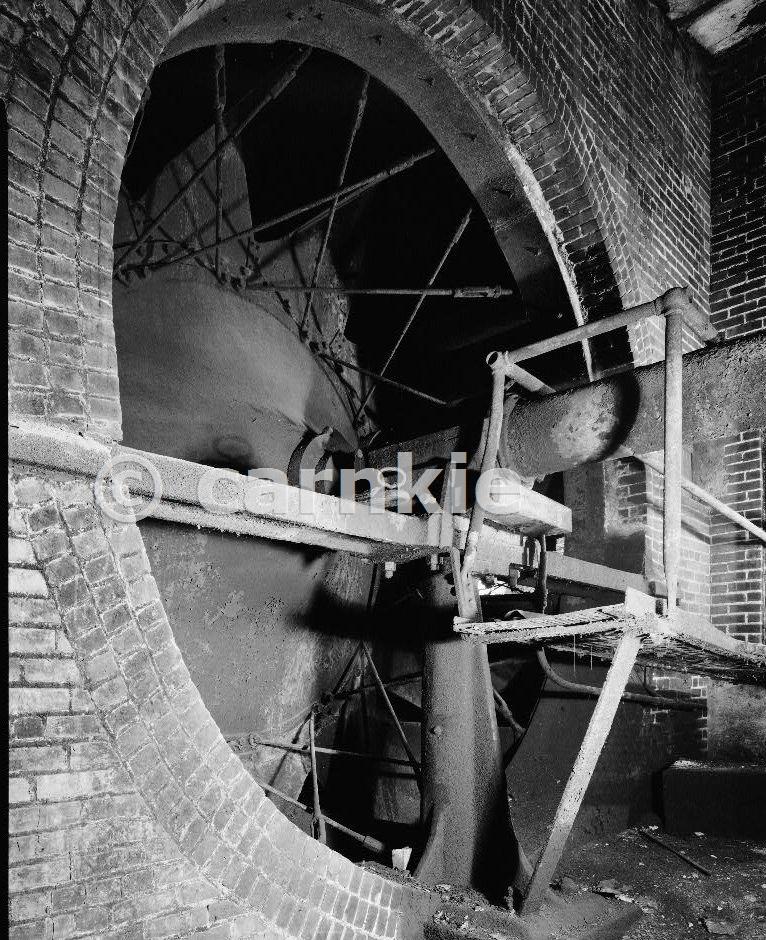 . INTERIOR VIEW OF BALTIMORE FAN HOUSE LOOKING NORTHEAST This view of the south airway shows the circular brick opening through which air was drawn to the center of the 28 foot diameter Dickson Guibal double inlet fan. Note the solid core of the Dickson-Guibal centrifugal fan and the bracing for the steel paddles. The shaft, shaft support and braces, and catwalk are in the right foreground. Courtesy Library of Congress, Prints & Photographs Division, HAER Reproduction number HAER PA,40-WILB,5-19