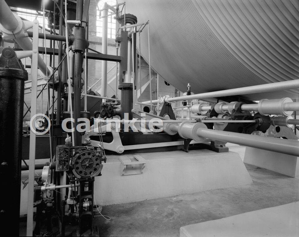 INTERIOR VIEW OF LAST NO. 2 HOIST HOUSE, FROM BENEATH HOISTING DRUM AND OPERATOR'S PLATFORM, SHOWING LILLY OVERRUN PROTECTOR (FOREGROUND), THROTTLE LEAKAGE (UPPER LEFT), HYDRAULIC CYLINDERS FOR BRAKE SYSTEM AND REVERSING GEAR. See links in description Courtesy Library of Congress, Prints & Photographs Division, HAER, Reproduction HAER MICH,31-HANC,1-60