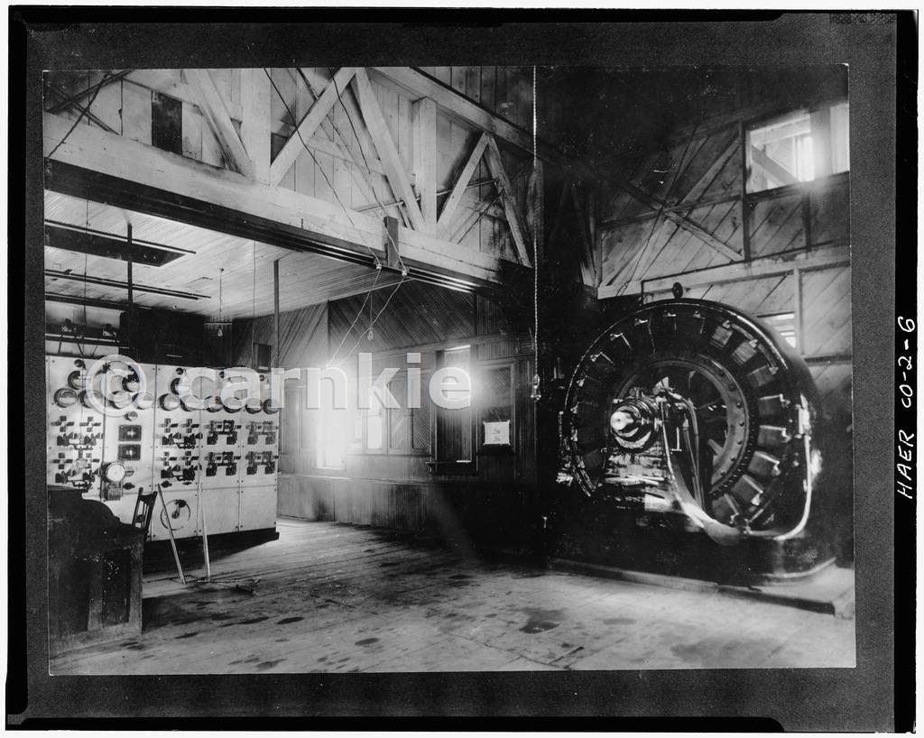 INTERIOR VIEW (c.1900) OF 1895 POWER HOUSE SHOWING SWITCHBOARD ON LEFT AND GENERATOR ON RIGHT. Courtesy Library of Congress, Prints & Photographs Division, HAER, Reproduction number HAER COLO,57-AMES.V,2A-6