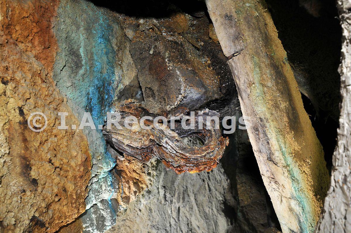 Delaminating iron eye bolt on the ore chute in level (under Stewart''s stope), west off the Main Adit. [October 2012]