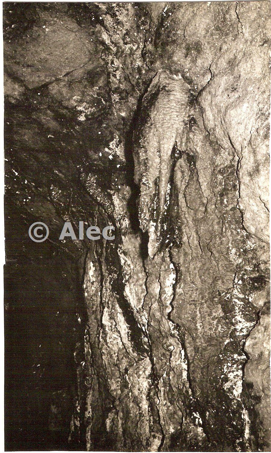 Not a good subject for B and W film, but leached minerals had created this orange 'stalactite' at one location in the tunnel.