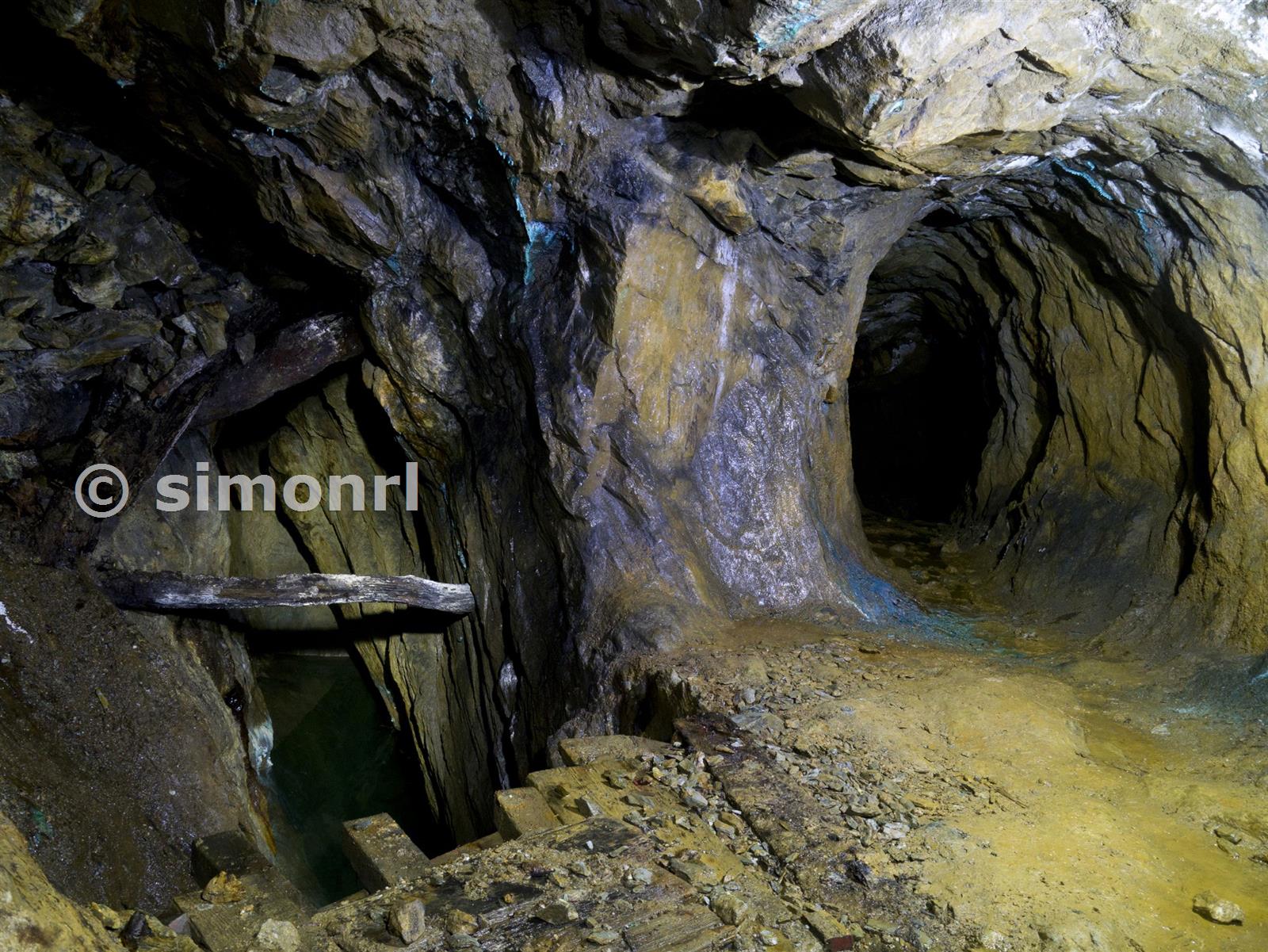 A junction on the main drive with a section of false floor over a flooded stope Drws y Coed Copper Mine September 2013