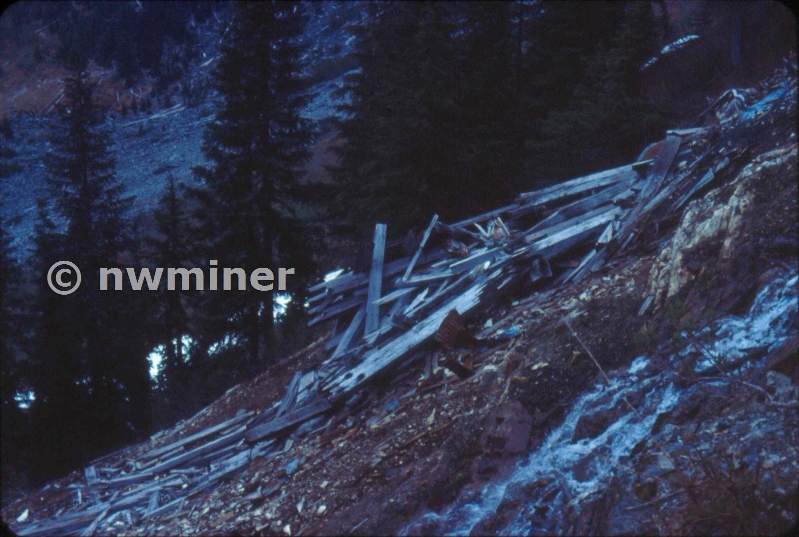 Ore bunker ruins below main adit - drainage from adit in foreground. Photo taken spring 1973.