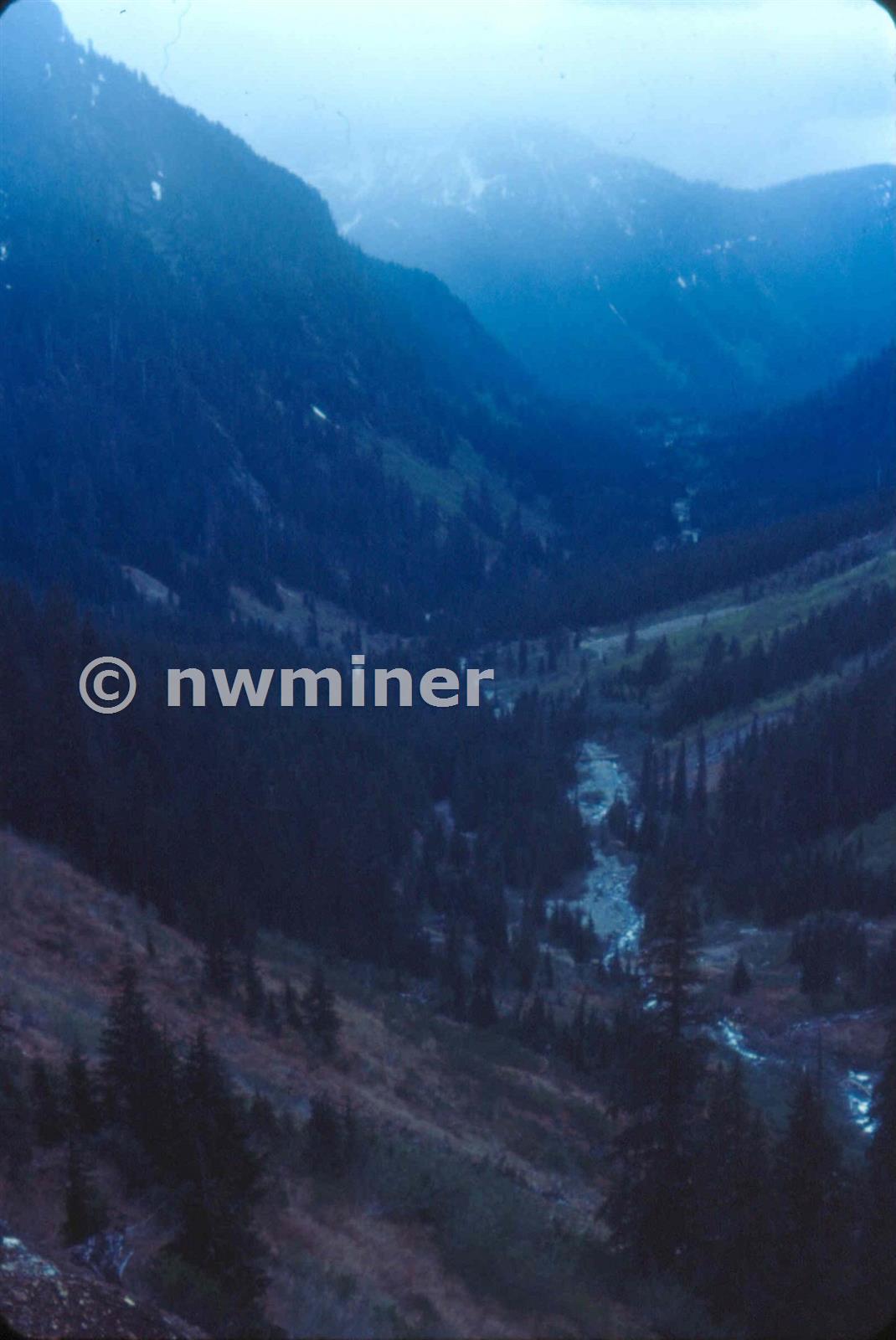 Sauk River valley from main adit. Railroad was built up valley in 1890's to serve mines in area. Photo spring 1973.