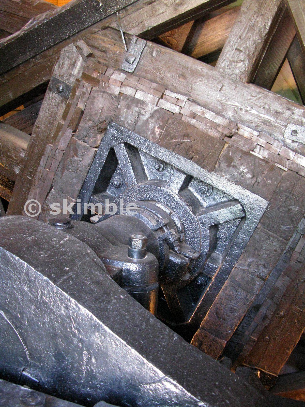 centre of the 13.6 m wooden waterwheel, showing small pieces of wood used to adjust the balance of the wheel. 27/06/2011