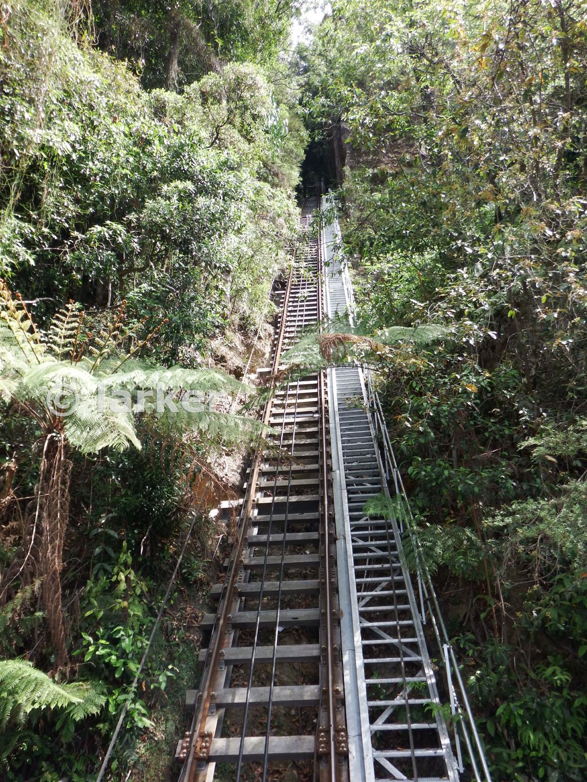 The inclined railway constructed to haul coal from the mine to the top of the cliff. A narrow gauge railway then connected to the main line near Katoomba Station. Allegedly the steepest incline railway in the world at max. angle of 52°. Makes for an exciting ride. It is now referred to as the Scenic Railway.