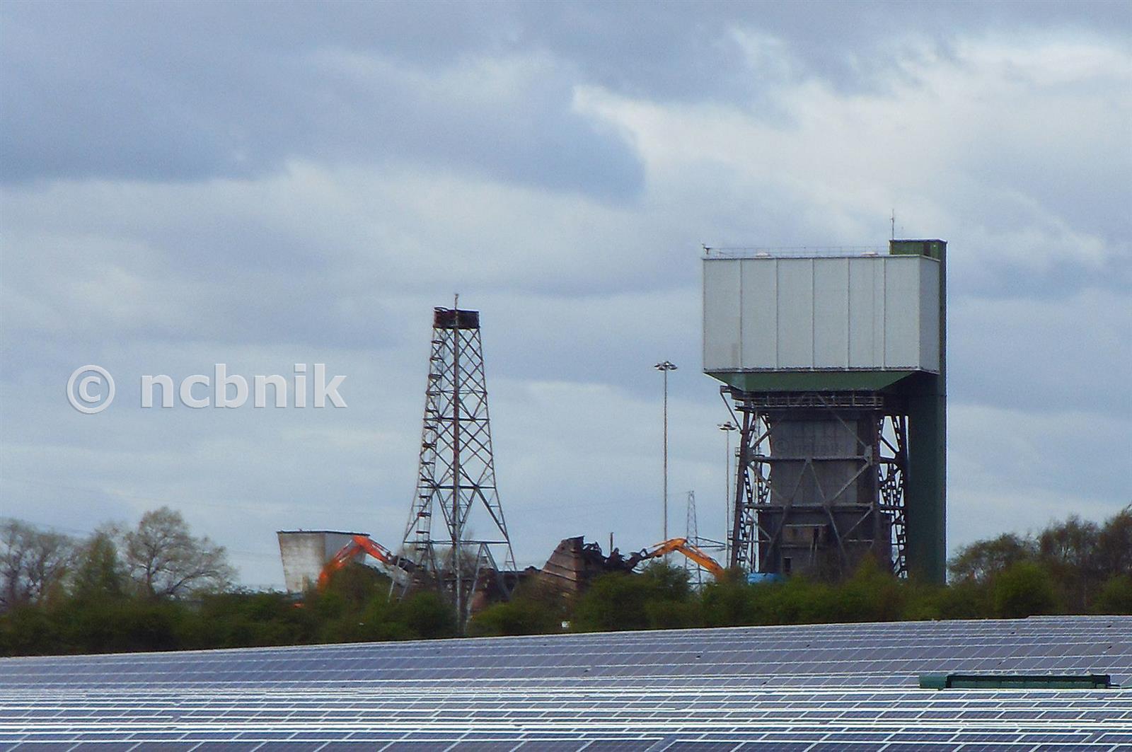 By May 2017 the demolition was well advanced; here two ''JCB''s peck a remaining bit of the ''prep'' to bits. The headgear shown was demolished the following November. In the foreground is the solar array - the great hope for the nation''s energy future; we''ll see....