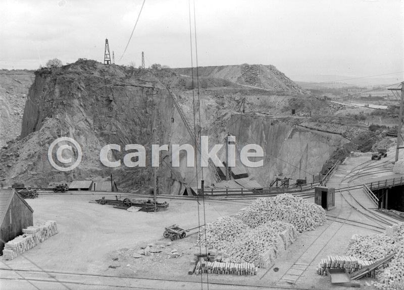 Kemnay Quarries, Kemnay. Aberdeenshire. General view of surface working in grey muscovite-biotite granite. Shows pit-like form of quarry 122 m. deep while above on the skyline is a large waste tip. A light railway network is seen with several bogies used for transporting stone. Adjacent to the railway is a stockpile of kerbs and setts (cassies). A large crane is seen on the edge of the pit while a dismantled crane can be seen near the railway. Right through the photograph in the centre is a 'blondin' lifting cable. Photo P000005. Reproduced with the permission of the British Geological Survey ©NERC. All rights Reserved.