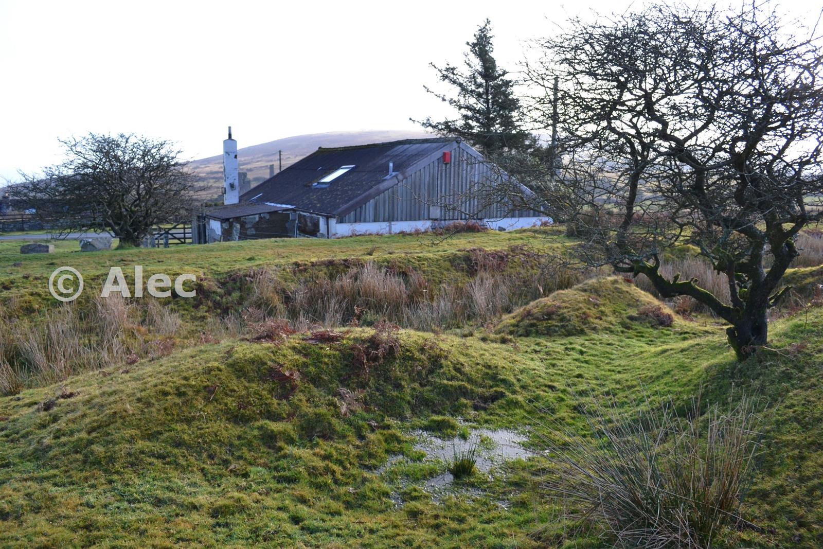 Trackbed of the 1858 Kilmar Railway on a low embankment across the view with disturbed ground associated with early workings on the South Phoenix/Wheal Prosper sett in the foreground. The low building was converted from a concrete reservoir constructed for the 1907-1911 South Phoenix reworking: it became the Minions Men''s Institute and is now an outdoor centre for Truro School.
