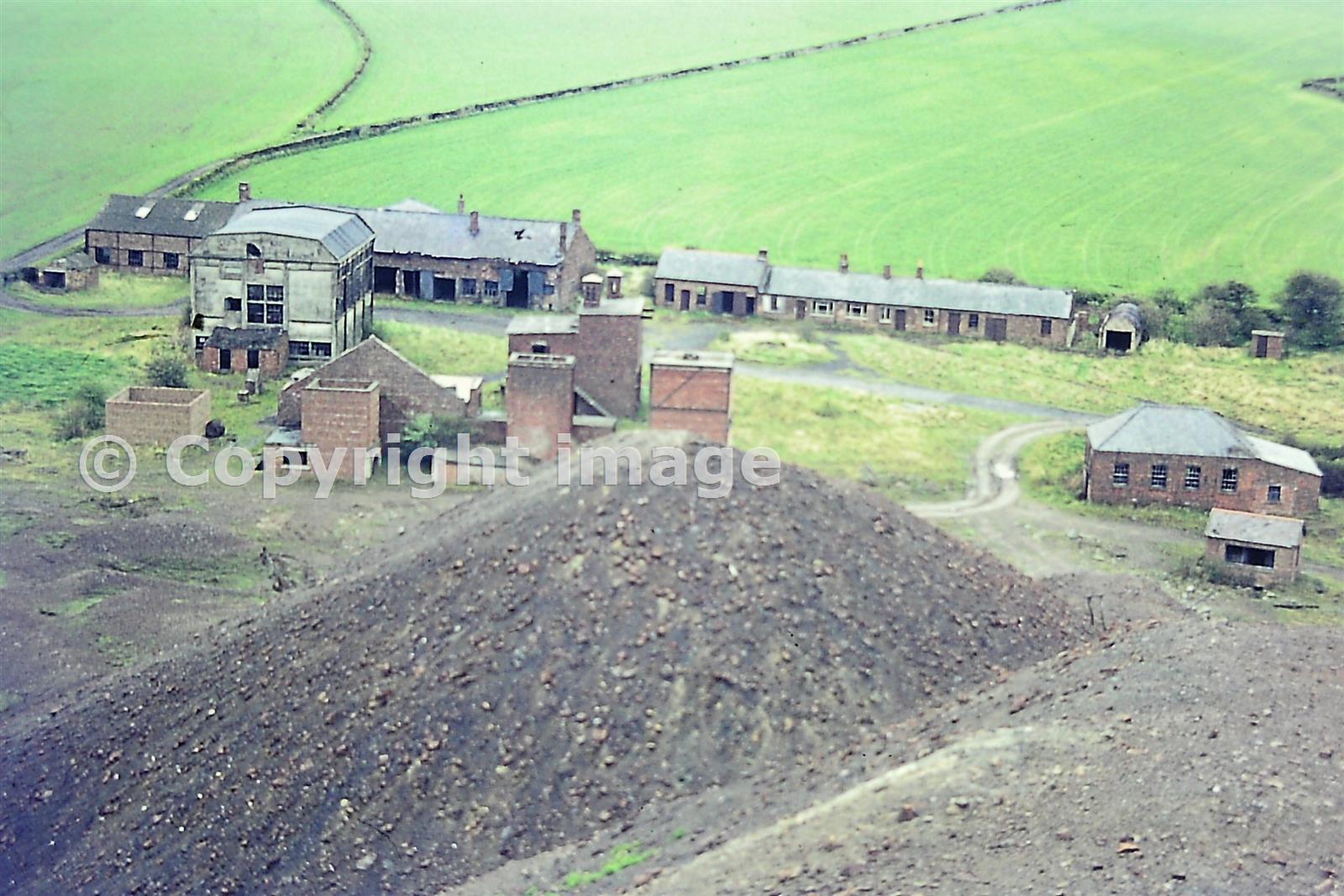 Taken sometime after closure (1963) and before photo already in this album (1975 - based on state of buildings eg roof on middle distance RH range). The view is to the south as per link provided by Yorkshireman of 1950 OS and current OS mapping aerial view, probably from near the top of the spoil tip. Explanation thanks to simonrail Kilton Mine photo description. Front left the square brick wall is around the downcast shaft which at this time was still 700 feet deep (since filled). The big concrete building behind was the main winding house erected about 1913 to contain new electric winding equipment. Behind this is a row of workshops; at left end a shop for maintaining diesel locos introduced underground here in 1951, the first in Cleveland. Adjoining to right the original workshops of 1875. The long low row in front of the hedge comprised offices and ambulance room. In right foreground is the small weigh-bridge office and behind an engine house for underground haulage (ropes down the back shaft) later converted to a winding house for the same shaft. The central square red tower with the diagonal stripe is the airlock at the top of the upcast or backshaft. To its left, with twin towers, electric sub-station of 1913. In front is exhaust tower (evasee) from single inlet Sirocco fan. To left again the single peaked wall is the remains of the engine house for a steam-driven Guibal fan 30 feet diameter. This building was later converted to a lamp cabin. In front of the peaked wall is the evasee from an Aeroto through-flow fan of 1950s vintage which was sited in the gap at the base where the tree is growing. From the downcast shaft at left to the front of the upcast was the heapstead containing a large picking belt which is why the huge mound of shale was built from this viewpoint and not directly from the shaft. Kilton Mine was sunk 1871 to 74 then abandoned. Re-opened 1897 and closed again 1920s. Re-opened again 1938 and closed 1963. In 2016 the concrete winding house remains in precarious state, the sub-station is damaged, and both shafts filled. Otherwise the site is overgrown and other buildings demolished. The conical tip remains as a RIGS in spite of the occasional attempts to remove it by the usual unimaginative local councillor.