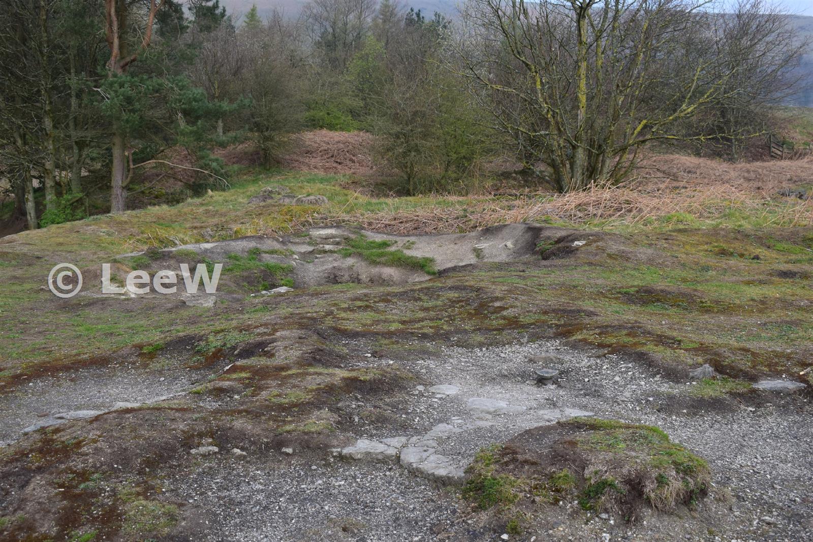 The grilled shaft is in the hollow. There are paved stones part buried in tip waste. The stones could be mounts for the headgear? The gin is located behind the shaft.