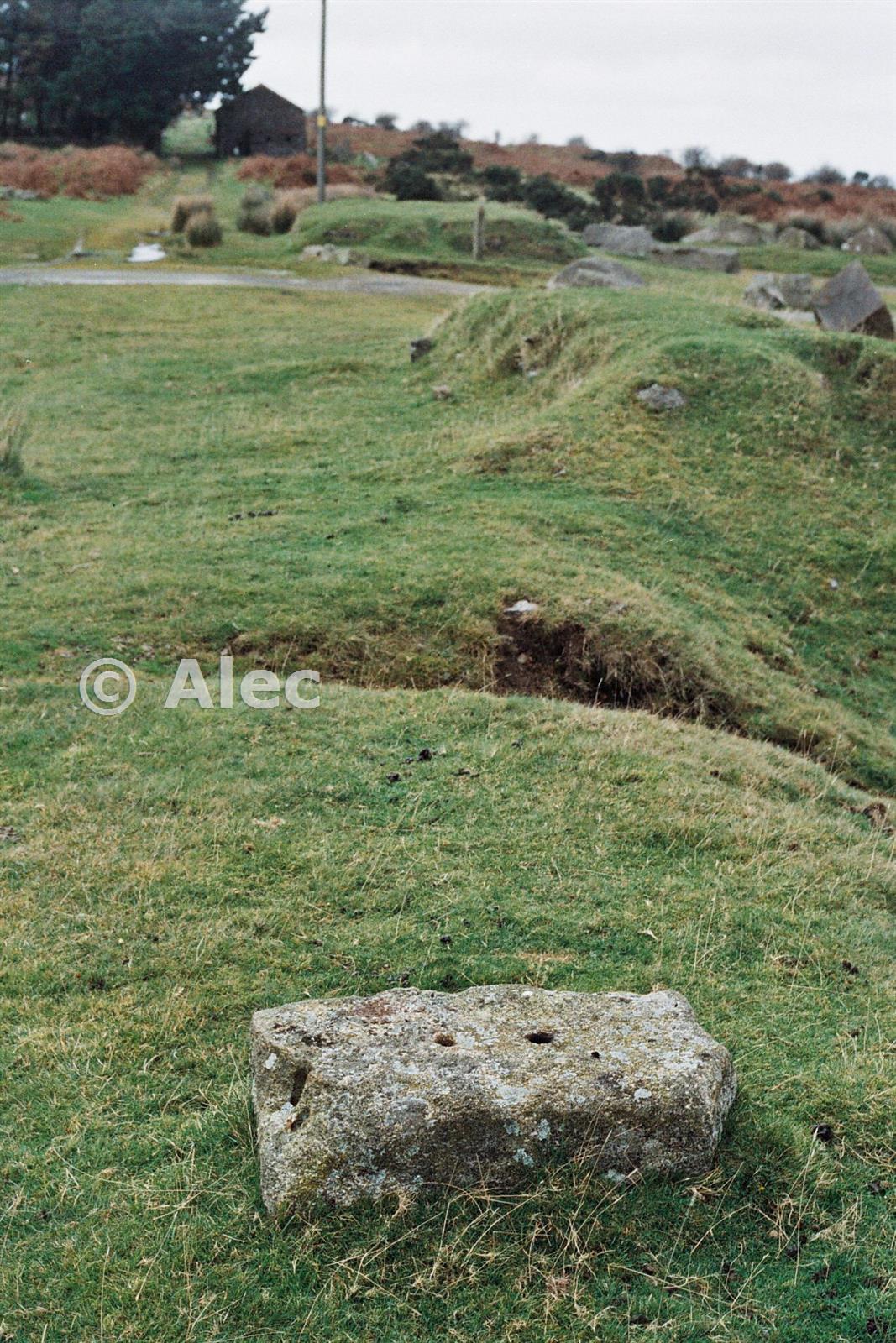 This photograph is taken from the ''stop block'' end of the goods shed siding - the platform and building would have been about a metre to the right of the photographer - looking down the linking spur line of 1884 which is curving away to the R distance to join the Kilmar Railway and the Kilmar Junction Railway. Virtually in situ, the sleeper block is drilled for a two-hole chair fixing. The 1844 L and CR route to Cheesewring Quarry can be traced leading straight into the distance, between the South Phoenix Miners'' Dry and the trees surrounding the Mine''s Carpenter''s Shop and Count House. In the centre mid-distance a Platform associated with the 1844 route (or, possibly, the former Narrow Guage system serving Phoenix United) may be discerned. [Revised 13 December 2019]