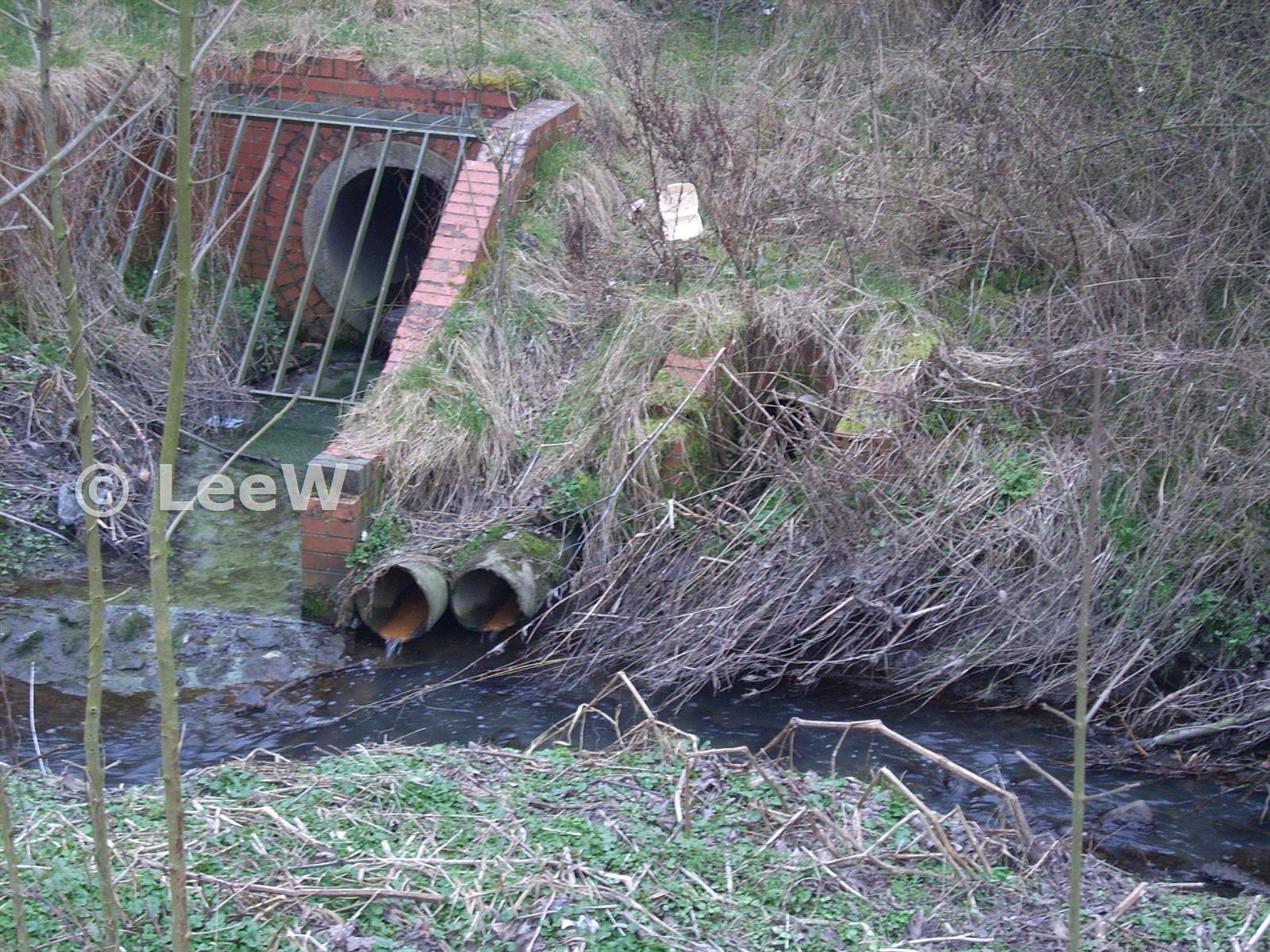 The smaller pipes or the pipe in the small brick revetment are likely more modern outlets for the sough. The large pipe is the stream culvert (Mar 2011)