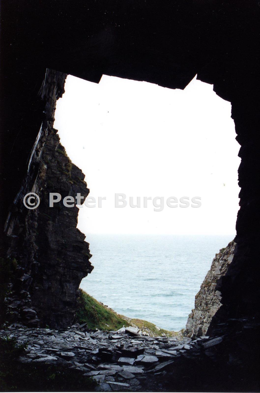 View out of a 'box cave', Lanterdan Quarry. These galleries do not seem to have been worked beyond the reach of daylight.