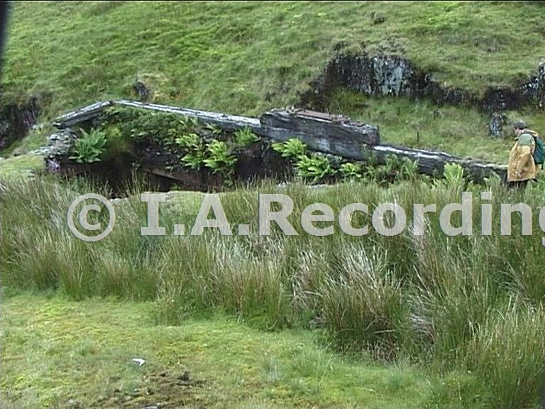 Large waterwheel pit originally for a 60ft waterwheel (replaced c1900 by a 56ft. wheel by John Mills & Co. Llanidloes) for pumping at Engine shaft. [Grab from 12th July 2002 video]