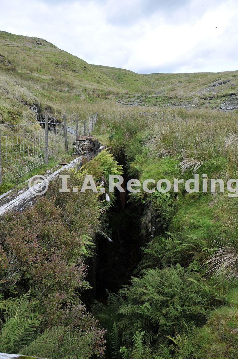 Large waterwheel pit, used for the 60ft waterwheel (replaced c1900 by a 56ft wheel by John Mills & C0 Llanidloes) for pumping at Engine shaft (in the background). In the 16 years since the last visit the area around the pit has been fenced off and is more overgrown.