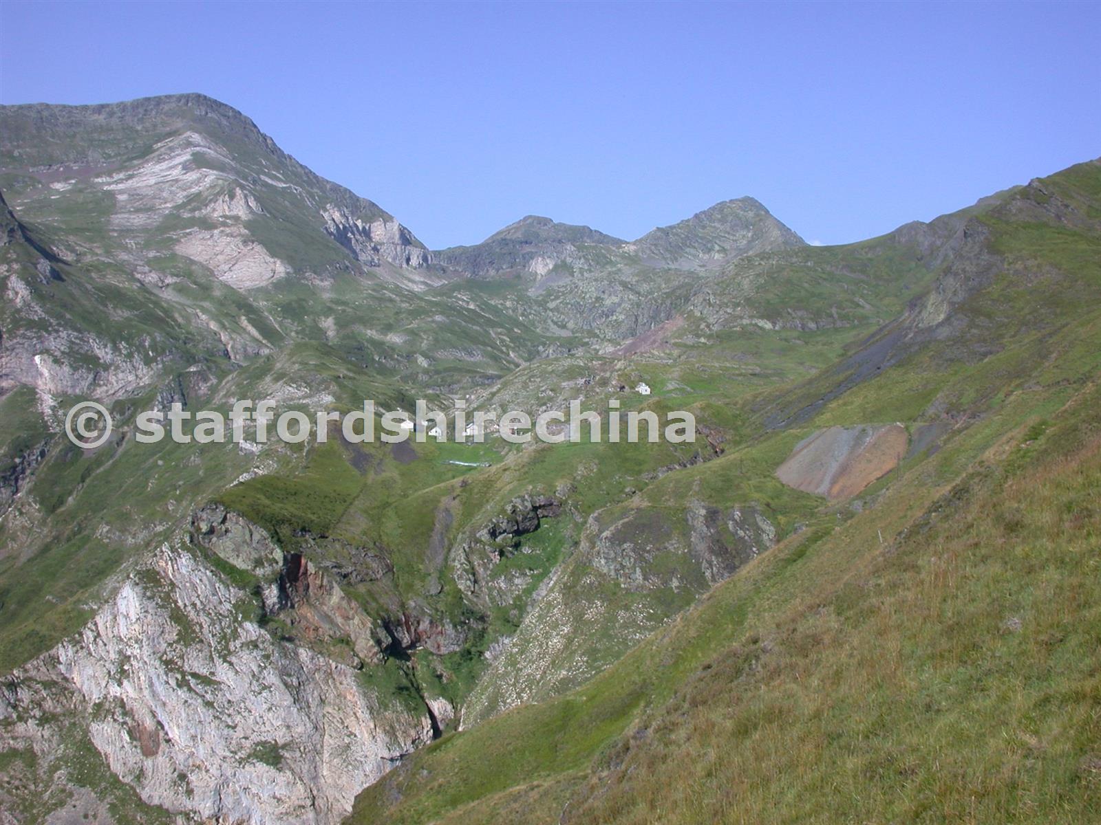 Retreating back down the mountain via a footpath to Eylie. Looking back at the mine buildings. The tip on the right is for hydro scheme tunnels, not mines. The French-Spanish border is the top of the ridge in the distance. Gouffre Martel is in the rock face slightly left of centre near the skyline too. 2006