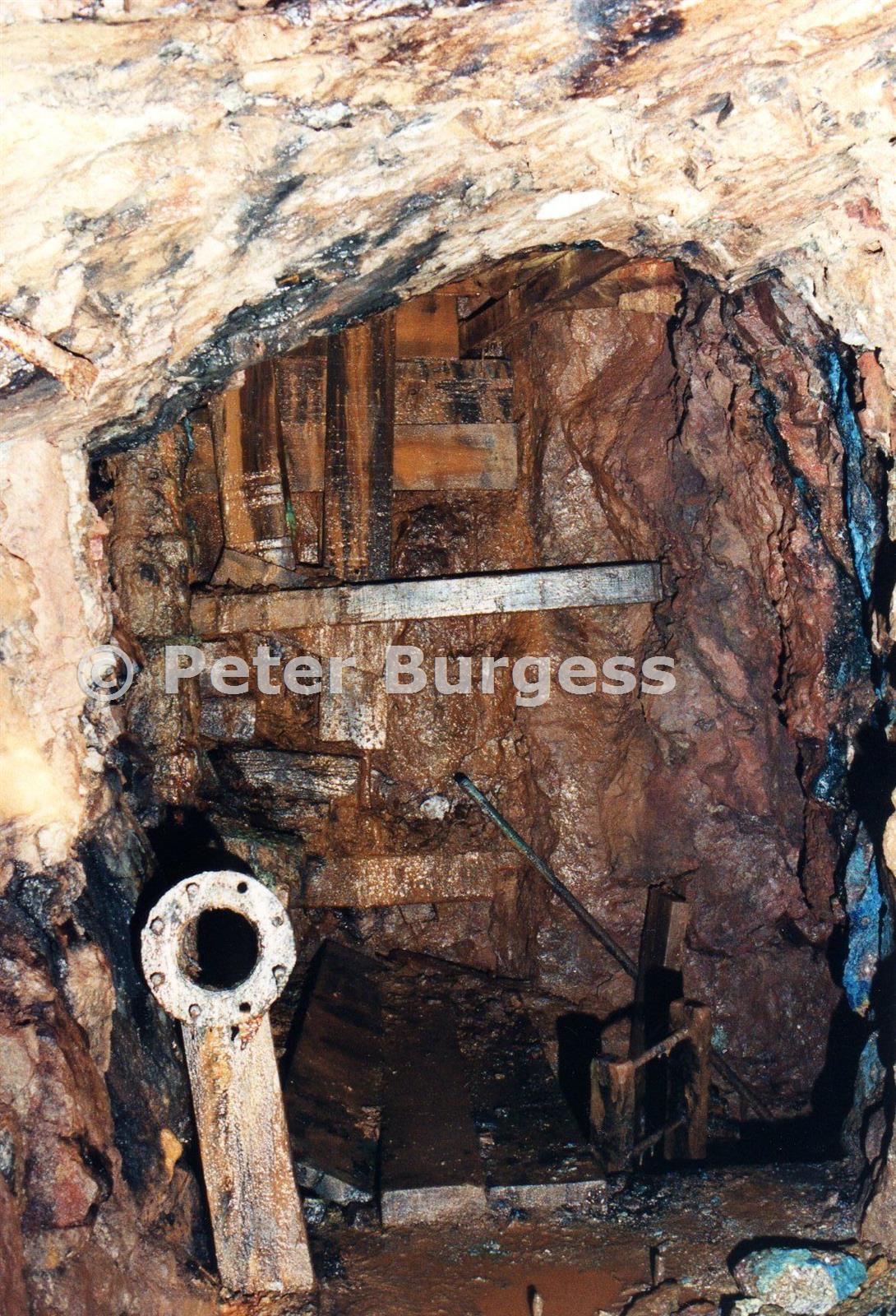 Levant Engine Shaft at 180fm level (Geevor 14 level). Note top of ladder, and pipework.