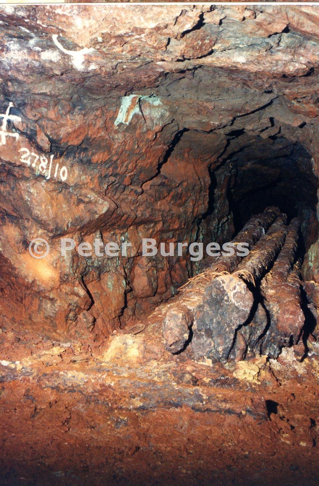 Store of pipework in a side passage off Branch Lode (North Lode) 278 fm level. 278 fm level is where experiments with underground steam traction took place, and where Levant first introduced pneumatic rock drills.