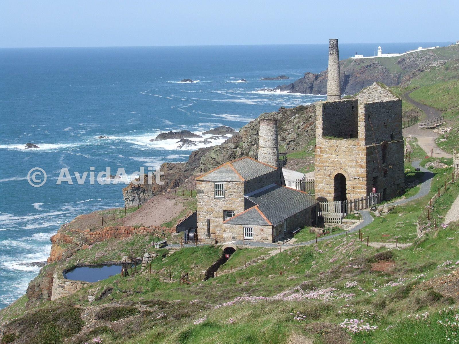 A general view looking at the collection of Winding and Pumping engines at the shaft head. The water for the Winding engine is held in the pond on the far left perched above the sea. Pendeen Lighthouse is on the cliff beyond.