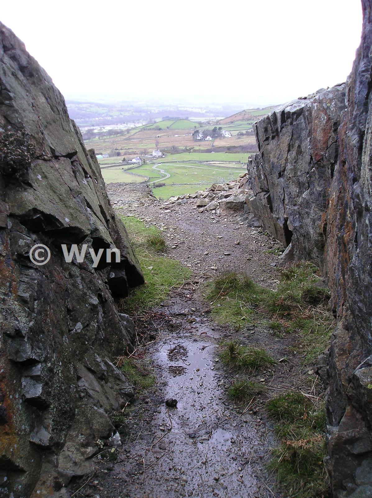 Looking out of workings, Pen y Gaer can be seen in the distance.