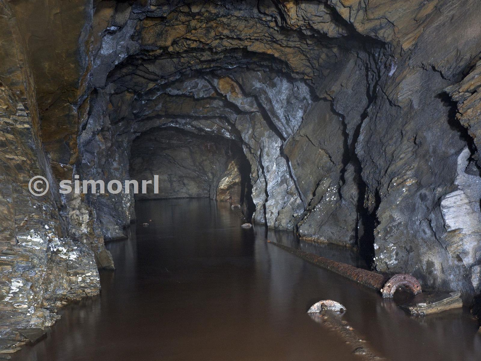 Short section of level leading to crimp to flooded lower workings. Rhiwbach slate mine May 2012