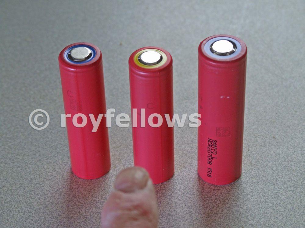 Left to right, Sanyo 18650 3500 mAh, Panasonic 18650 2600 mAh high (20 amps max) discharge, Sanyo 20700 4250 mAh 15 amp max discharge.