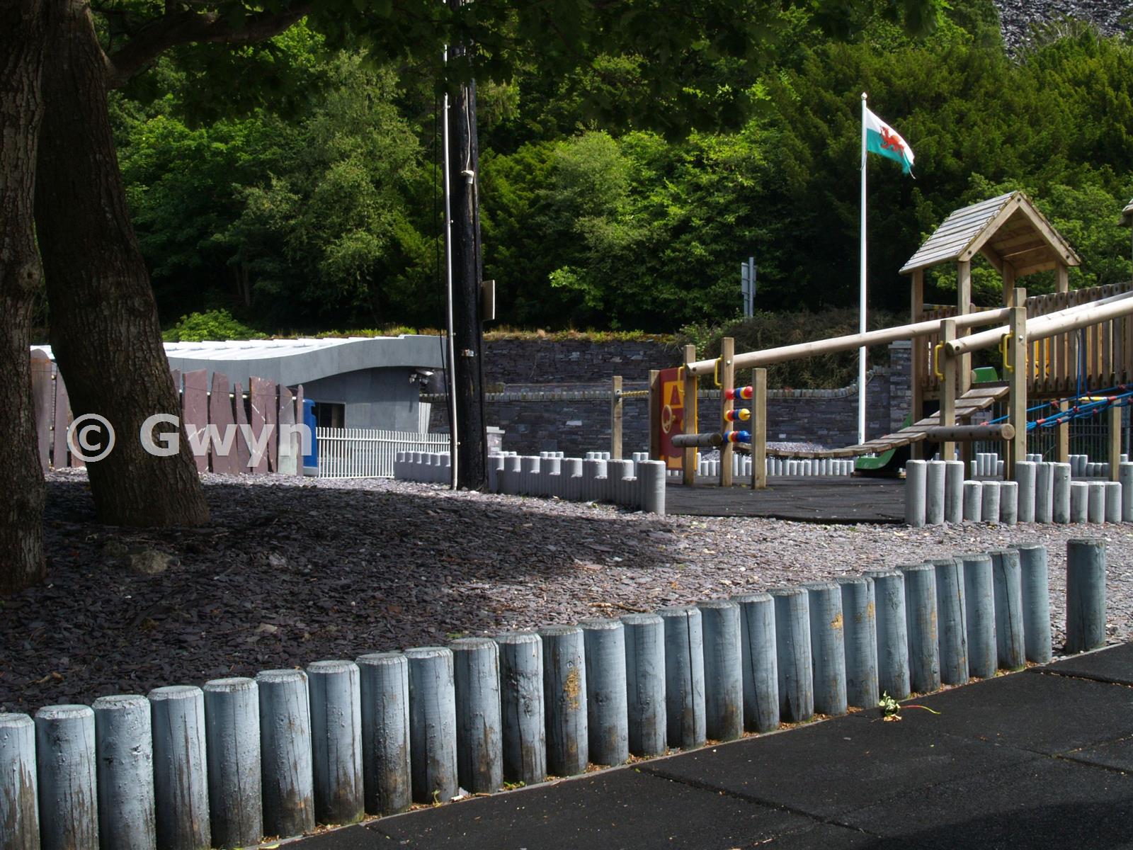 The childrens' play area. The building with the wave-form roof is the modern cafe.