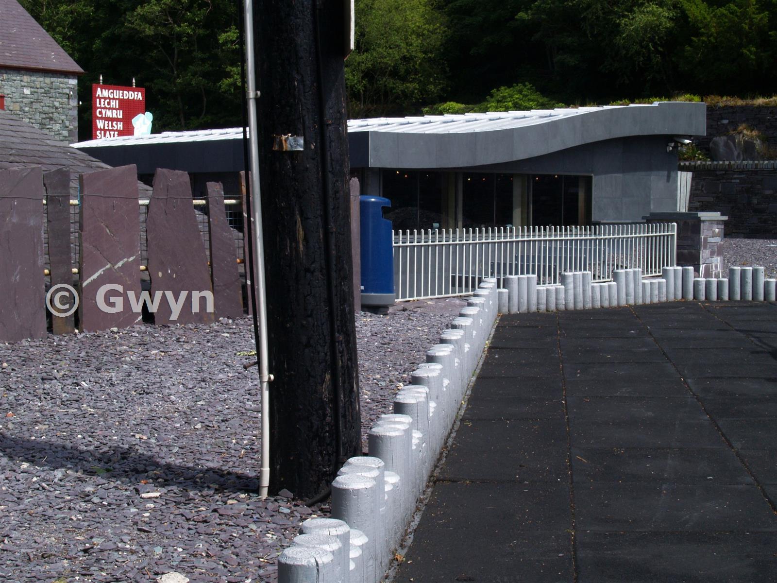 Childrens' play area. The wave-form roofed building is the modern cafe.