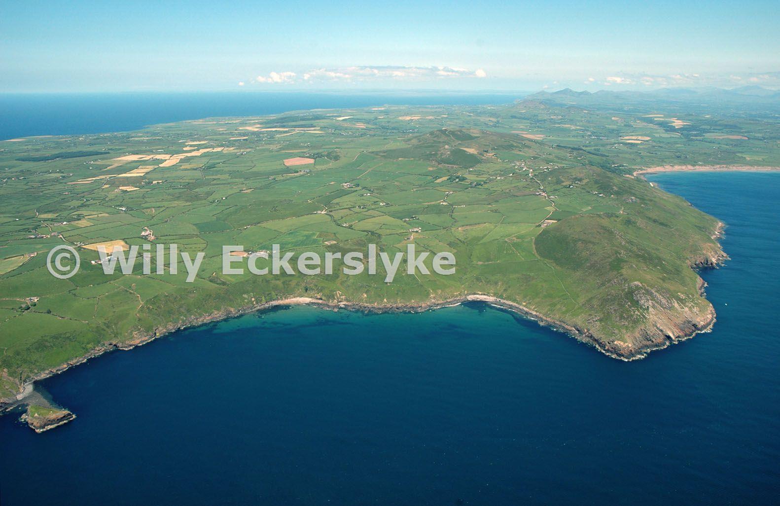 Maen Gwenonwy islet at left, Porth Ysgo beach and Nant y Gadwen in centre, Trwyn Talfarach at right, Porth Neigwl/Hell's Mouth beach far right, Anglesey and Yr Eifl in distance.