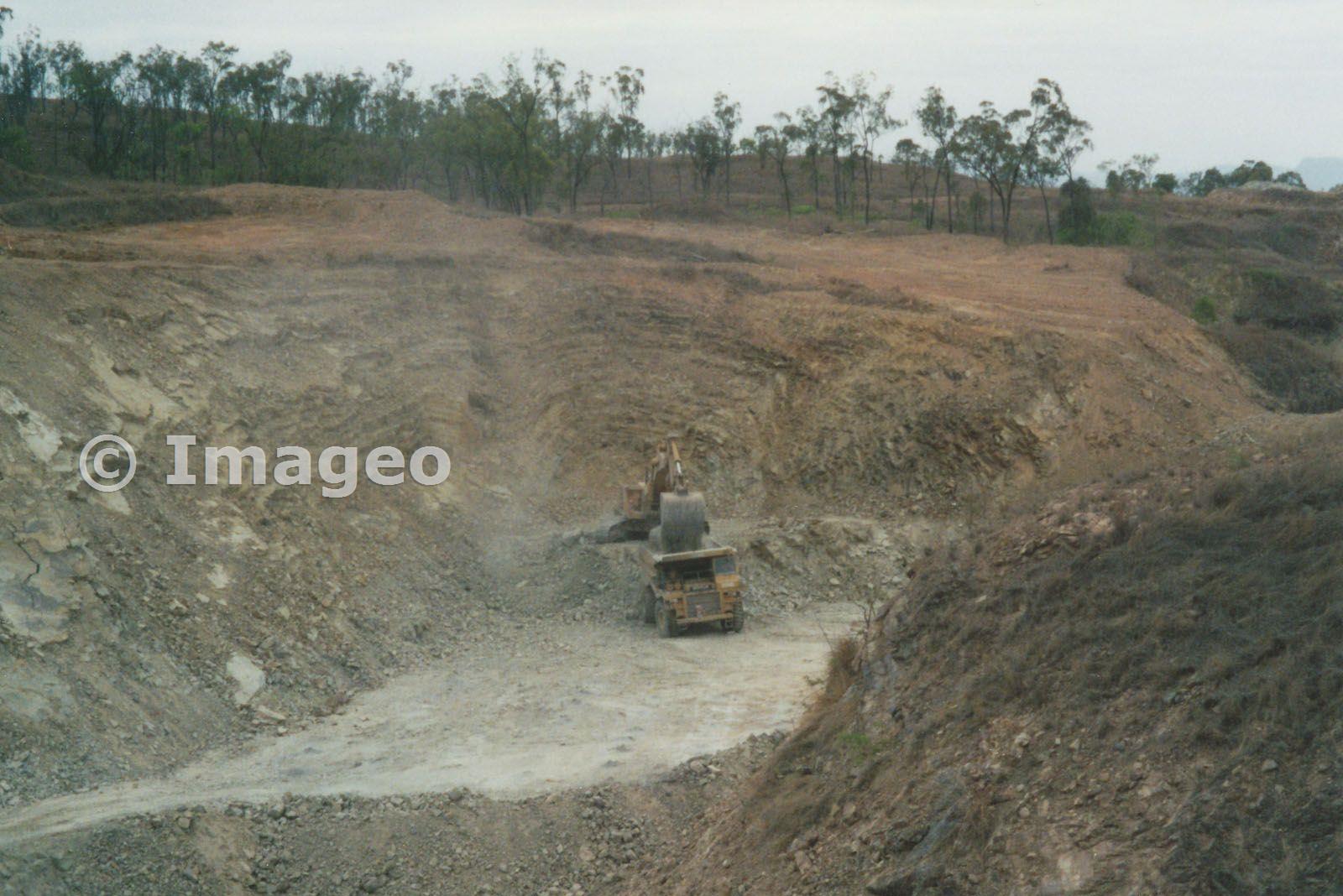 Excavator loading waste sandstone from the hanging wall into a Cat 773 truck. Looking east, ca. 2001