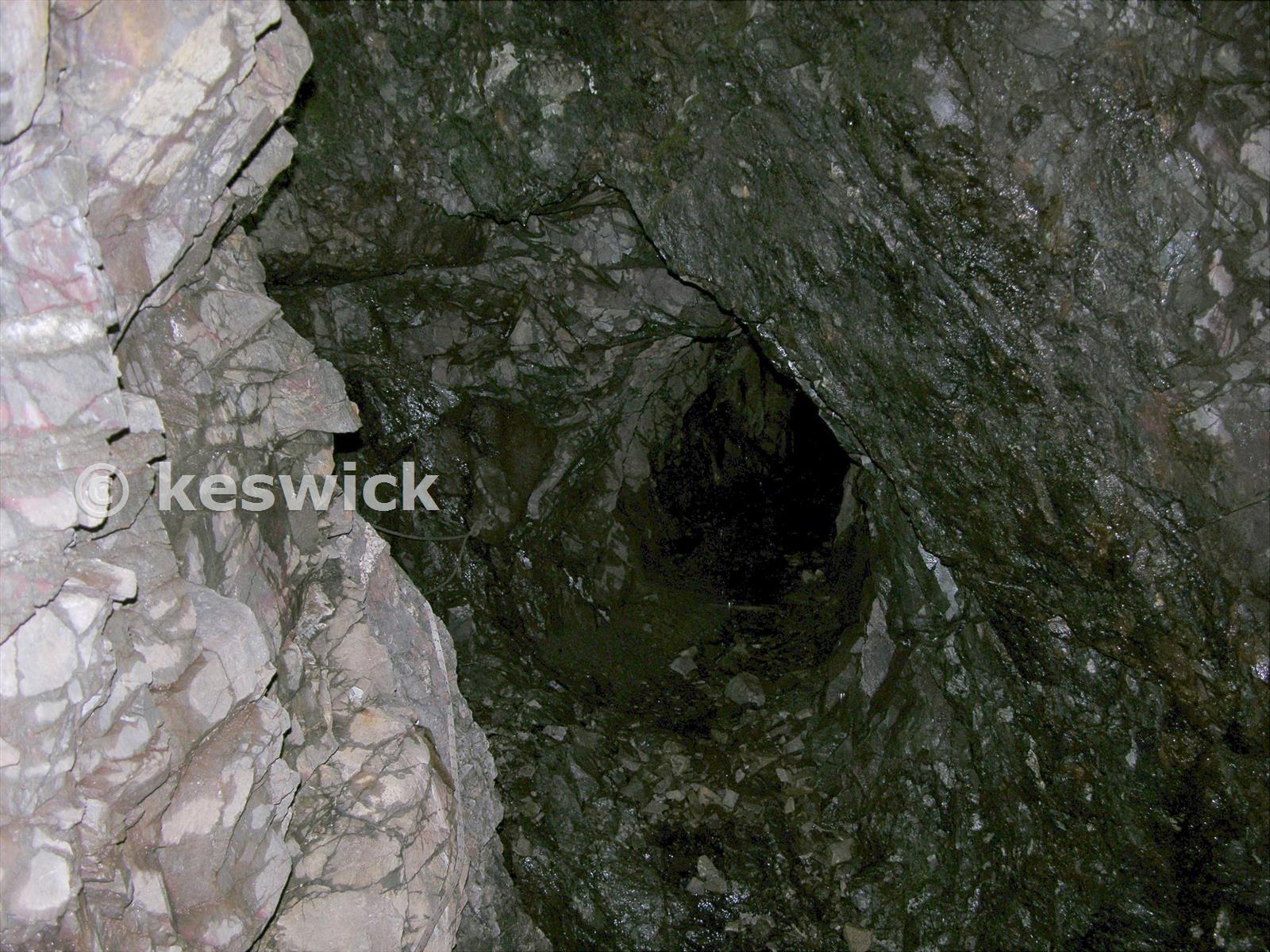 About 10 meters in from the entrance to Fareys Stage the top of the Grand Pipe opens in the floor of the level, an old fixed rope has been left in place on the left for crossing the shaft.