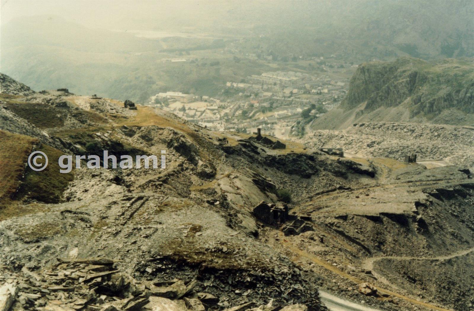 Viewed from the heights of Diffwys - You can see the actual Tuxford west tip with perched on it the erstwhile Maenofferen (Rhiwbach Tramway avoiding) Incline drumhouse (1920-28). Just visible (with chimney) above the Tuxford drumhouse is the Diffwys Floor 4 mill ruins.